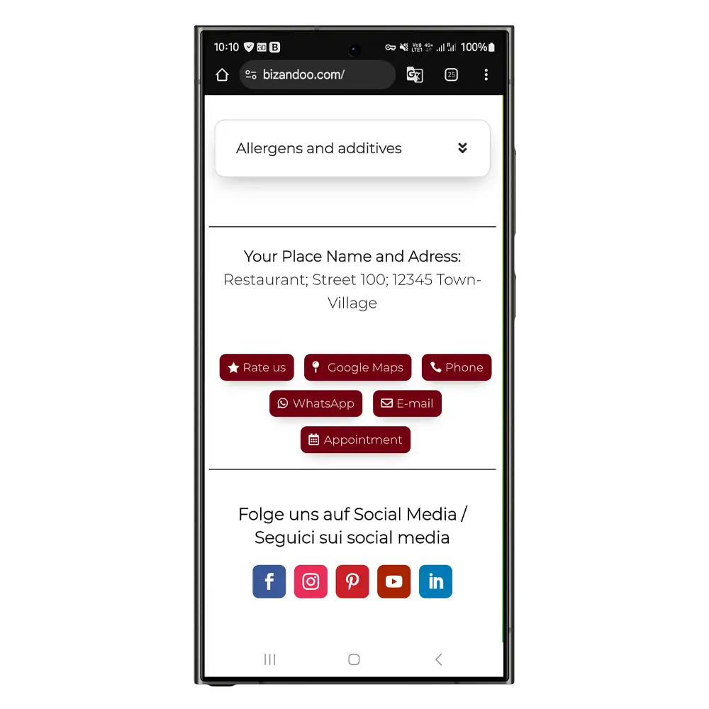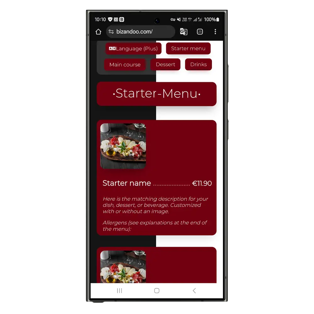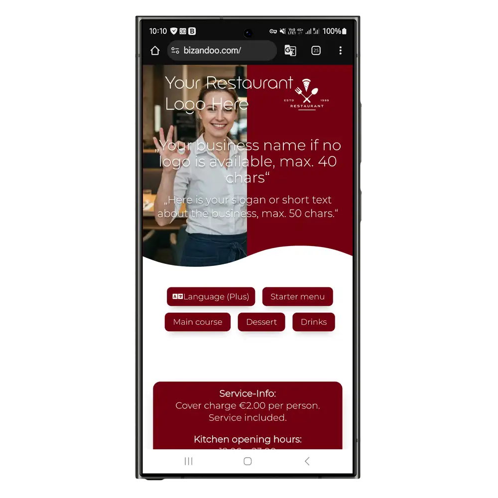 Nachfolgend siehst du den Aufbau der Bizandoo Smartpage und der Speisekarte.